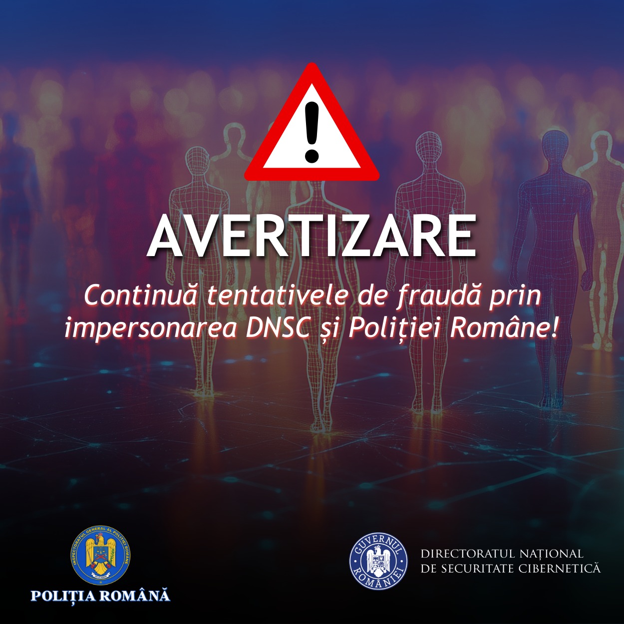 În ultima perioadă, au apărut mai multe pagini și mesaje online care impersonează Directoratul Național de Securitate Cibernetică și Poliția Română, având ca scop inducerea în eroare a cetățenilor și obținerea de bani, date financiare și cu caracter personal.