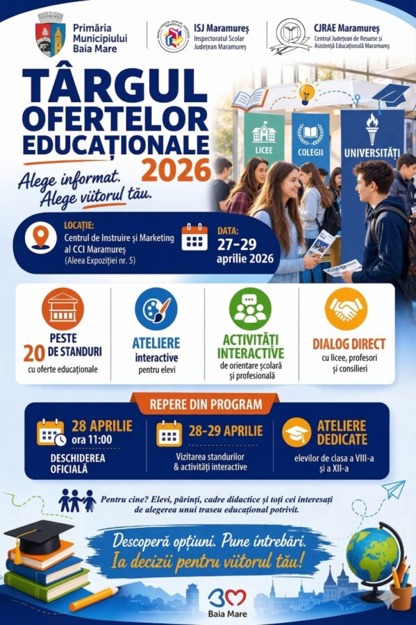 Municipiul Baia Mare, în parteneriat cu Inspectoratul Școlar Județean Maramureș și Centrul Județean de Resurse și Asistență Educațională Maramureș, organizează în perioada 27–29 aprilie 2026 evenimentul „Târgul Ofertelor Educaționale 2026”.