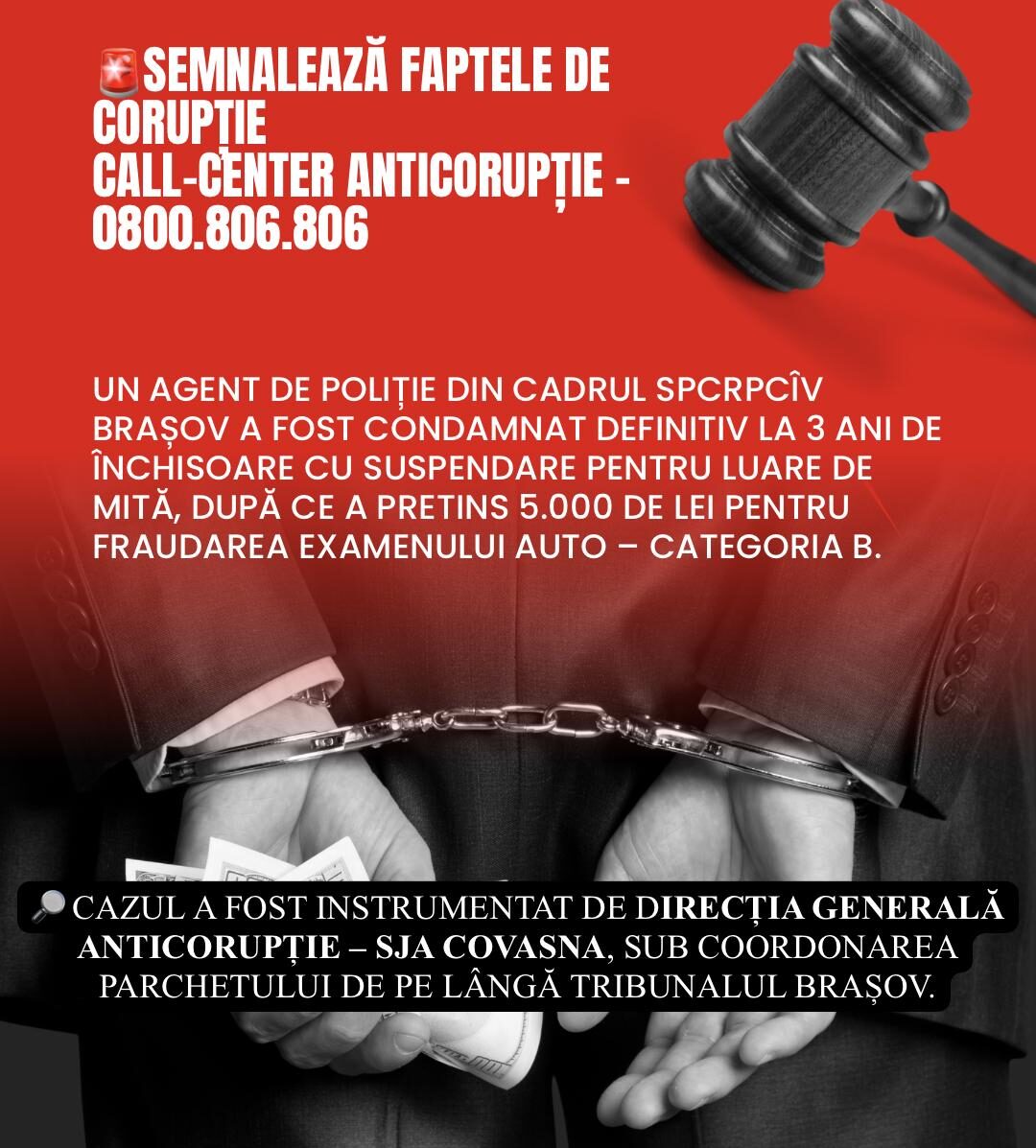 Polițist de la Permise Brașov, condamnat definitiv pentru luare de mită. 3 ani de închisoare cu suspendare