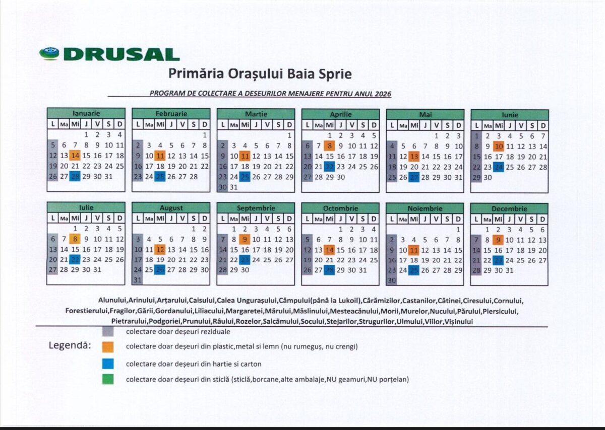 Primăria Orașului Baia Sprie anunță revenirea la programul de frecvență săptămânală pentru colectarea deșeurilor menajere, în urma discuțiilor purtate cu operatorul de salubritate SC DRUSAL SA.
