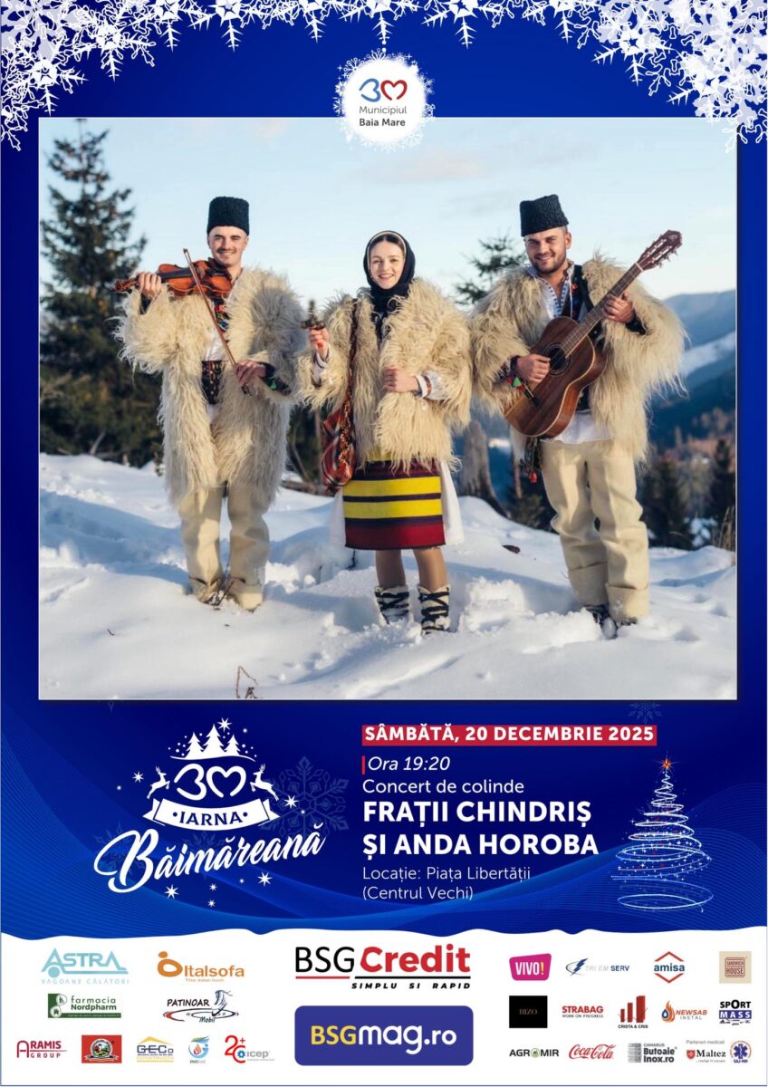 Centrul Vechi al municipiului Baia Mare devine, în această seară, locul unde tradiția și emoția sărbătorilor se întâlnesc. Sâmbătă, 20 decembrie 2025, de la ora 19:20, în Piața Libertății, publicul este invitat la un concert de colinde susținut de Frații Chindriș și Anda Horoba, în cadrul evenimentului Iarna Băimăreană.
