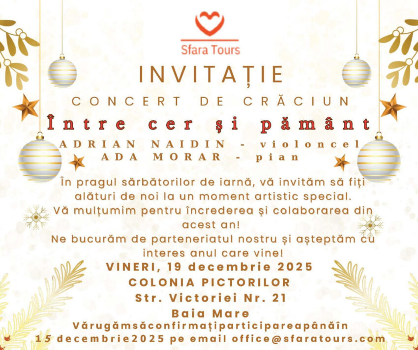 Evenimente Invitație la concertul de Crăciun „Între cer și pământ”, la Colonia Pictorilor din Baia Mare Citește mai multe Detectivul de Presă ȘOC! 3 zile acum