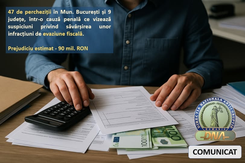 Procurorii din cadrul Direcției Naționale Anticorupție – Secția de Combatere a infracțiunilor asimilate infracțiunilor de corupție efectuează cercetări într-o cauză penală ce vizează suspiciuni privind săvârșirea, în perioada 2021 – ianuarie 2025, a unor infracțiuni de evaziune fiscală prevăzute de Legea 241/2005 pentru prevenirea și combaterea evaziunii fiscale, de către mai multe societăți comerciale și reprezentanți ai acestora, prejudiciul adus statului fiind estimat, la acest moment, la peste 90.000.000 de lei.