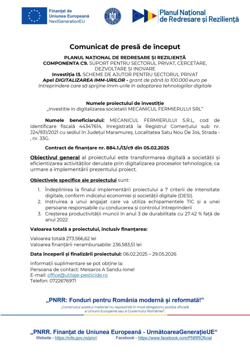 MECANICUL FERMIERULUI S.R.L., firmă din județul Maramureș, anunță începerea proiectului „Investiție în digitalizarea societății MECANICUL FERMIERULUI SRL”, un demers strategic finanțat prin Planul Național de Redresare și Reziliență, Componenta C9 – Suport pentru sectorul privat, cercetare, dezvoltare și inovare. Proiectul se desfășoară în cadrul schemei de ajutor pentru digitalizarea IMM-urilor și are rolul de a sprijini tranziția companiei către tehnologii moderne.