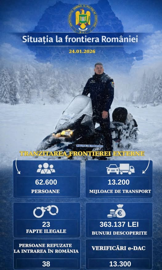 Poliția de Frontieră Română prezintă situația traficului la frontiera externă a României, valabilă pentru data de 24 ianuarie 2026. În acest interval, aproximativ 62.600 de persoane au tranzitat frontiera externă, împreună cu 13.200 de mijloace de transport, în cadrul activităților de control desfășurate la nivel național.