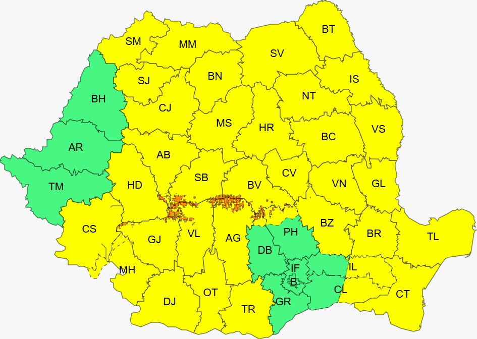 De asemenea, a fost emis și un cod portocaliu pentru zonele montane înalte, respectiv local în Carpații Meridionali și de Curbură, la altitudini de peste 1.600 de metri.